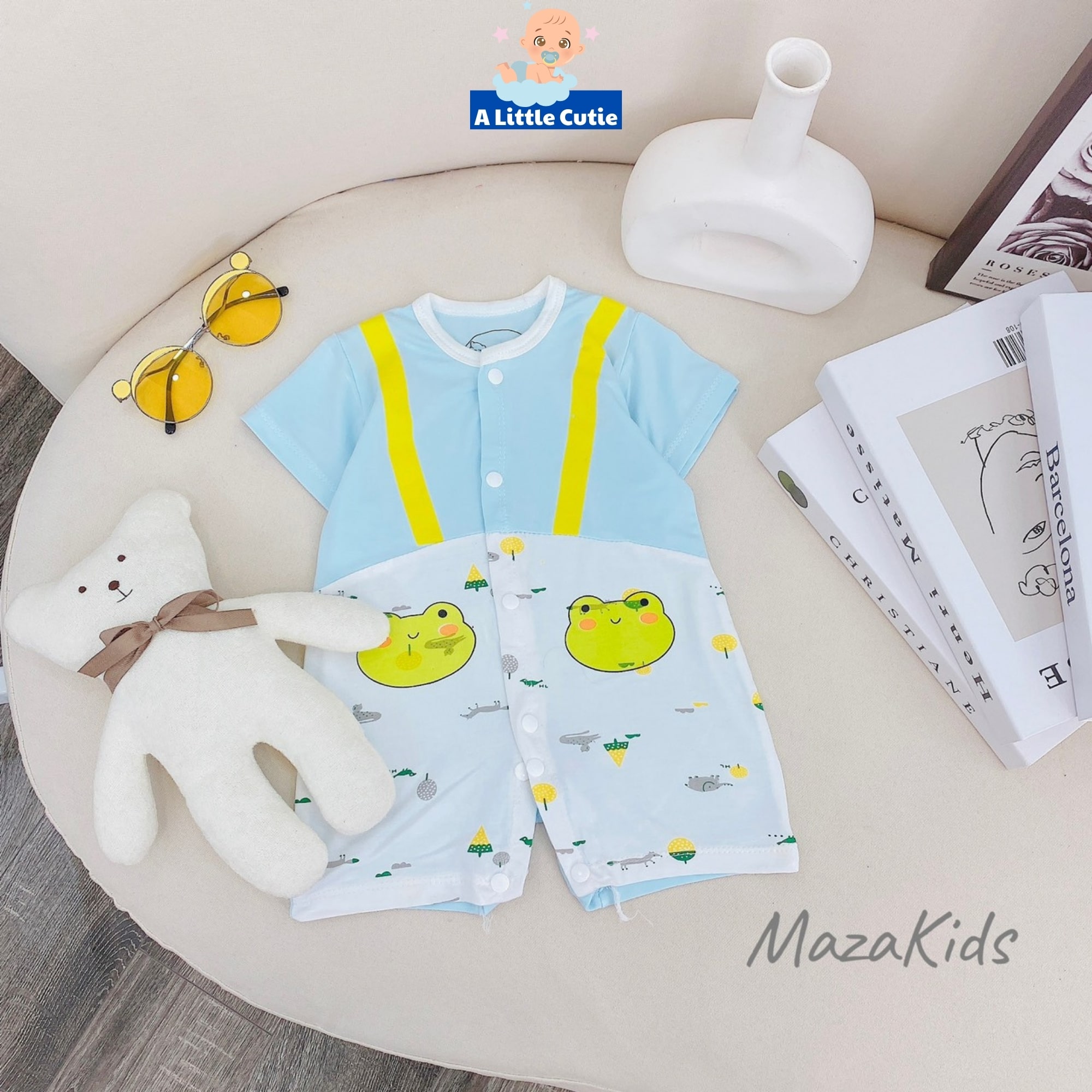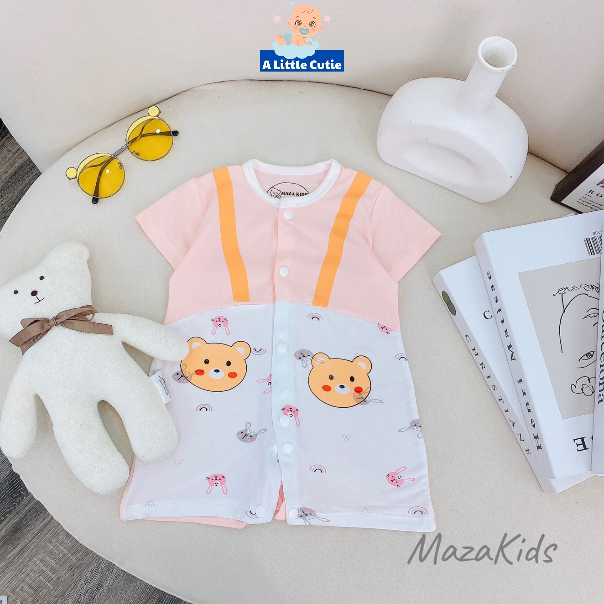 – Bodysuit cho bé, bodychip sơ sinh vải thun lạnh SG loại 1 BDS014 – A LITTLE CUTIE. Bộ body cộc tay, bộ liền thân cộc tay nền phối màu giả yếm in họa tiết vô cùng dễ thương.
